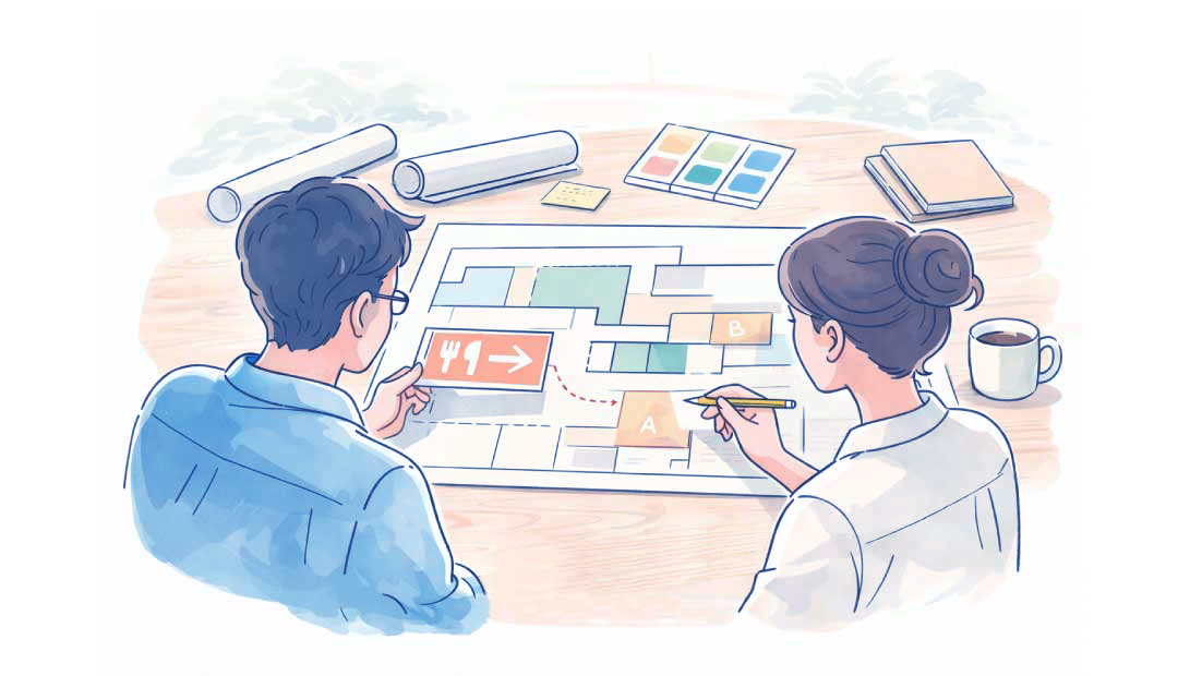 「どこに何があるか」を伝える前に、「人はどう動くのか」「どこで立ち止まるのか」を考えることが、結果的にサインの役割をシンプルにしてくれます。